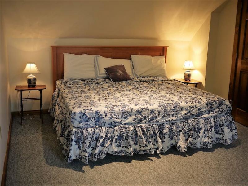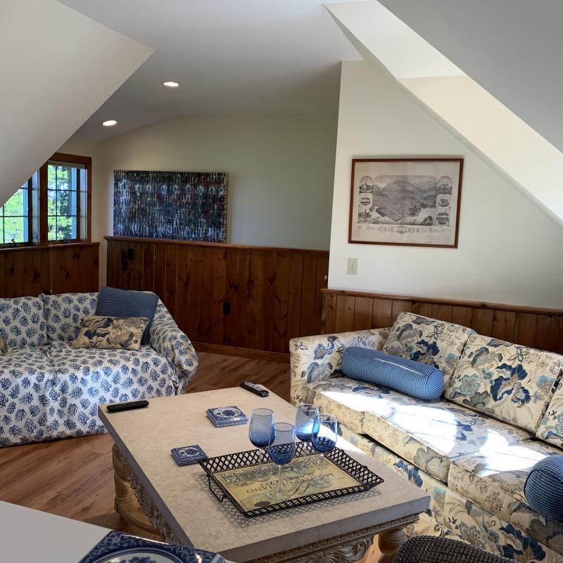 SECOND LEVEL GARAGE APARTMENT: Private entry into the open concept loft offering a dining area , table with seating for 4, small kitchen with standard appliances & a breakfast bar, and a living room with pullout couch for additional sleeping space. Bedroom with a king bed (2 twins together). 3/4 bath with shower (no tub). OTHER: Outside sitting area off the side of the garage with a couple of lounges and the gas grill.