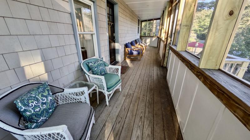 Access from the first floor, off the dining area leads out to an open deck and wrap-around covered and screened-in porch. Stairs lead from the open deck to the stone patio.