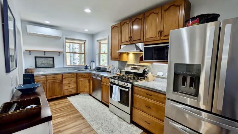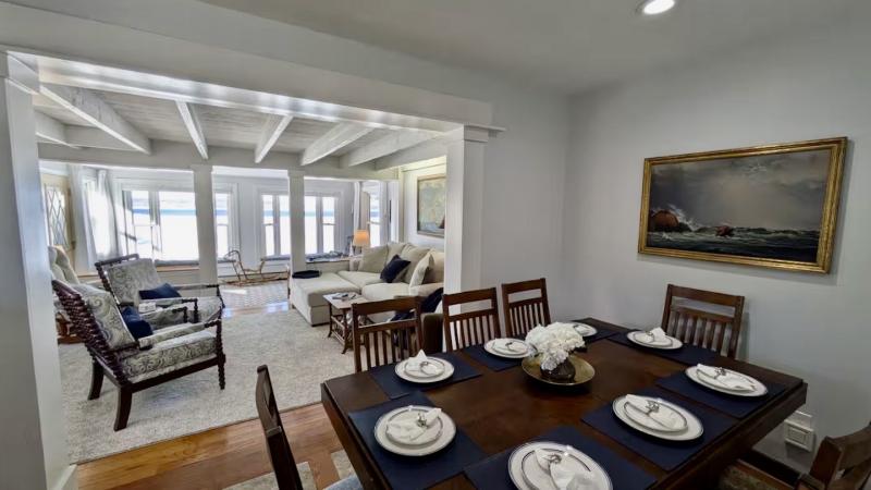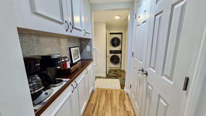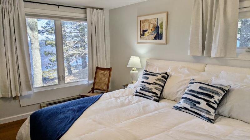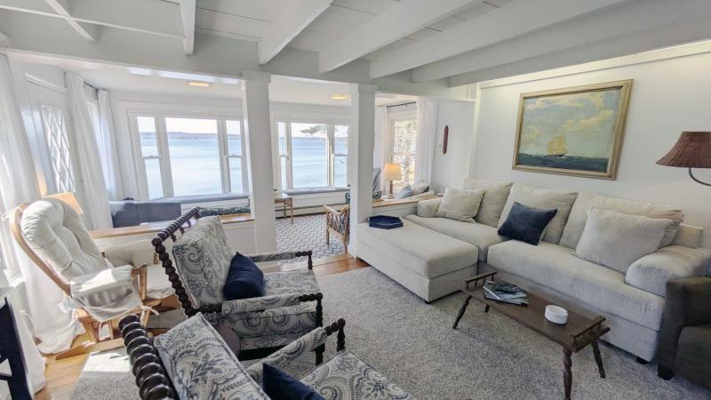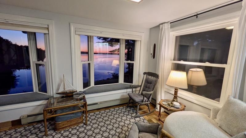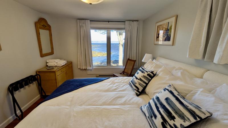 FIRST LEVEL: Entry. Fully equipped kitchen with high-end stainless steel appliances and plenty of counter space. Dining area with seating for 8. Spacious living room with large windows that fill the space with lots of natural light that steps down into the sunroom, offering views of the Mill Cove and beyond. Small hallway leads to a bedroom with a king bed, large walk-in closet and a large window with water views. Laundry closet. Full bath with walk-in shower and separate soaking tub.